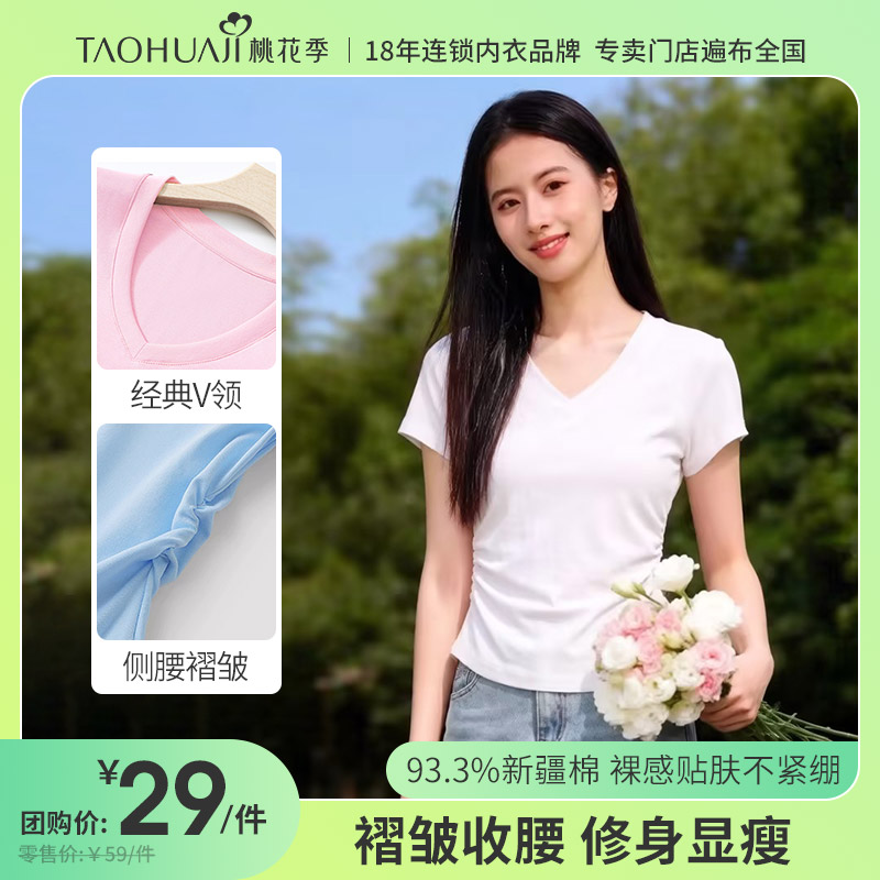 • 商品名称:Z00120桃花季V领纯棉短袖 2026新款夏季小个子褶皱收腰T纯色修身短款上衣女